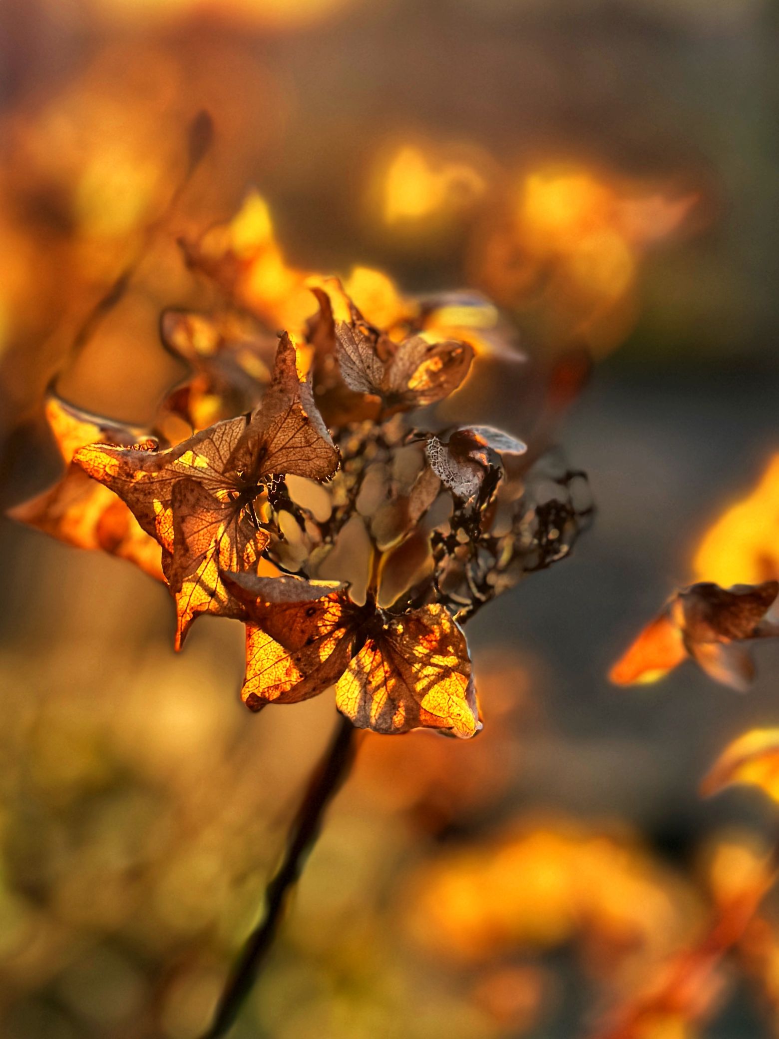 De foto van Wynanda was het einde van de zomer. Deze foto is een Hortensia in de Herfst met de avondzon schijnend op de bloem in mijn tuin.
